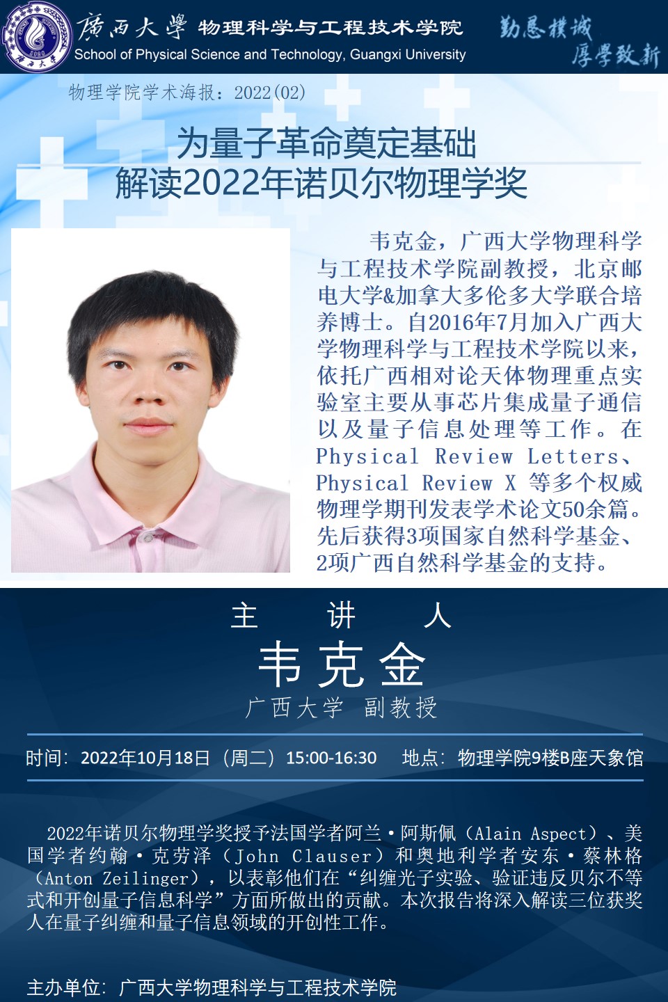 物理科学与工程技术学院学术报告:为量子革命奠定基础——解读2022年诺贝尔物理学奖