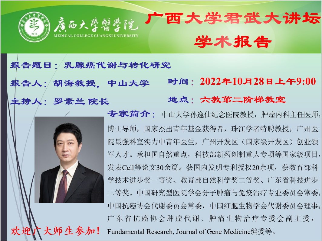 君武大讲坛医学院学术报告 乳腺癌代谢与转化研究
