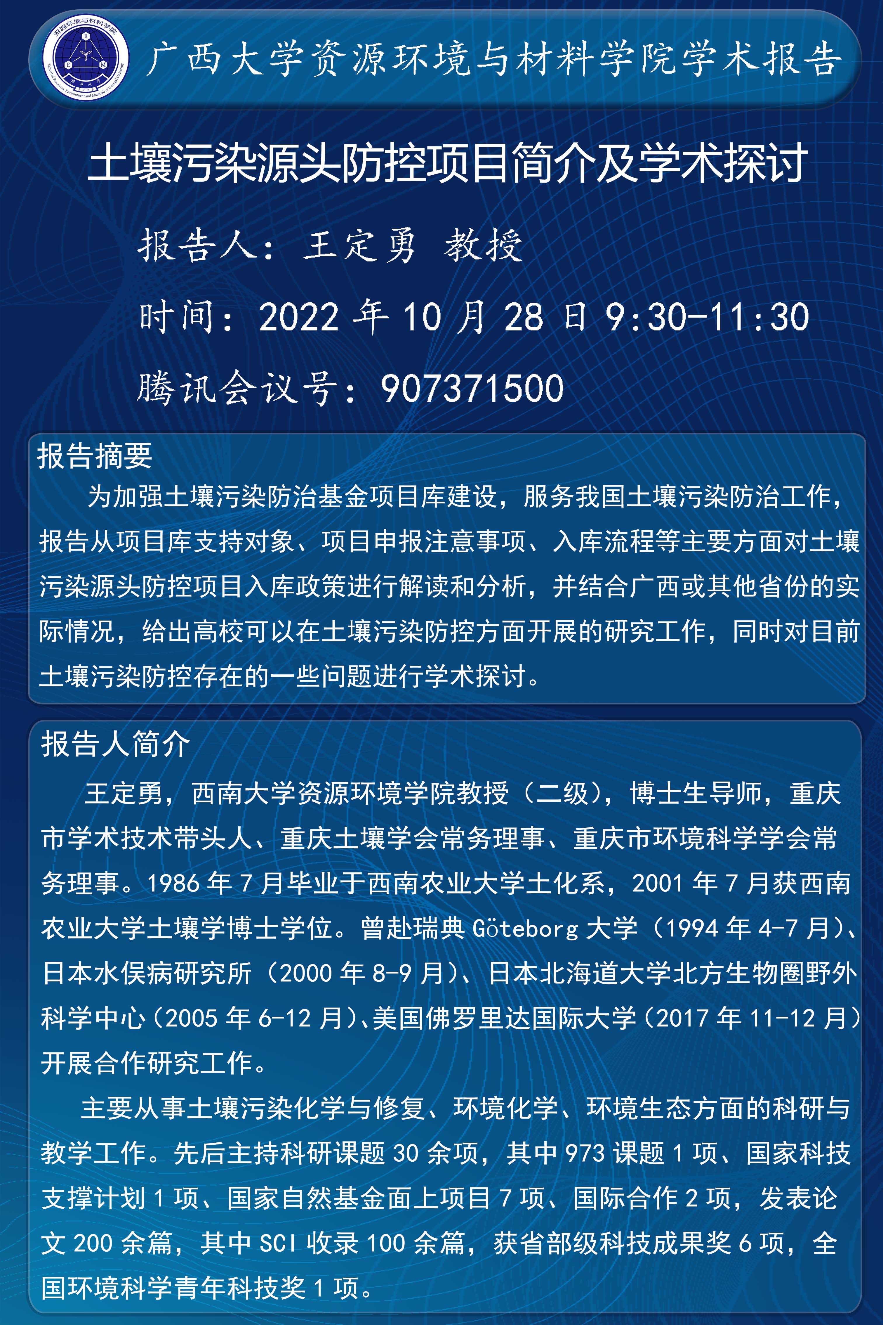 资源环境与材料学院学术报告:土壤污染源头防控项目简介及学术探讨