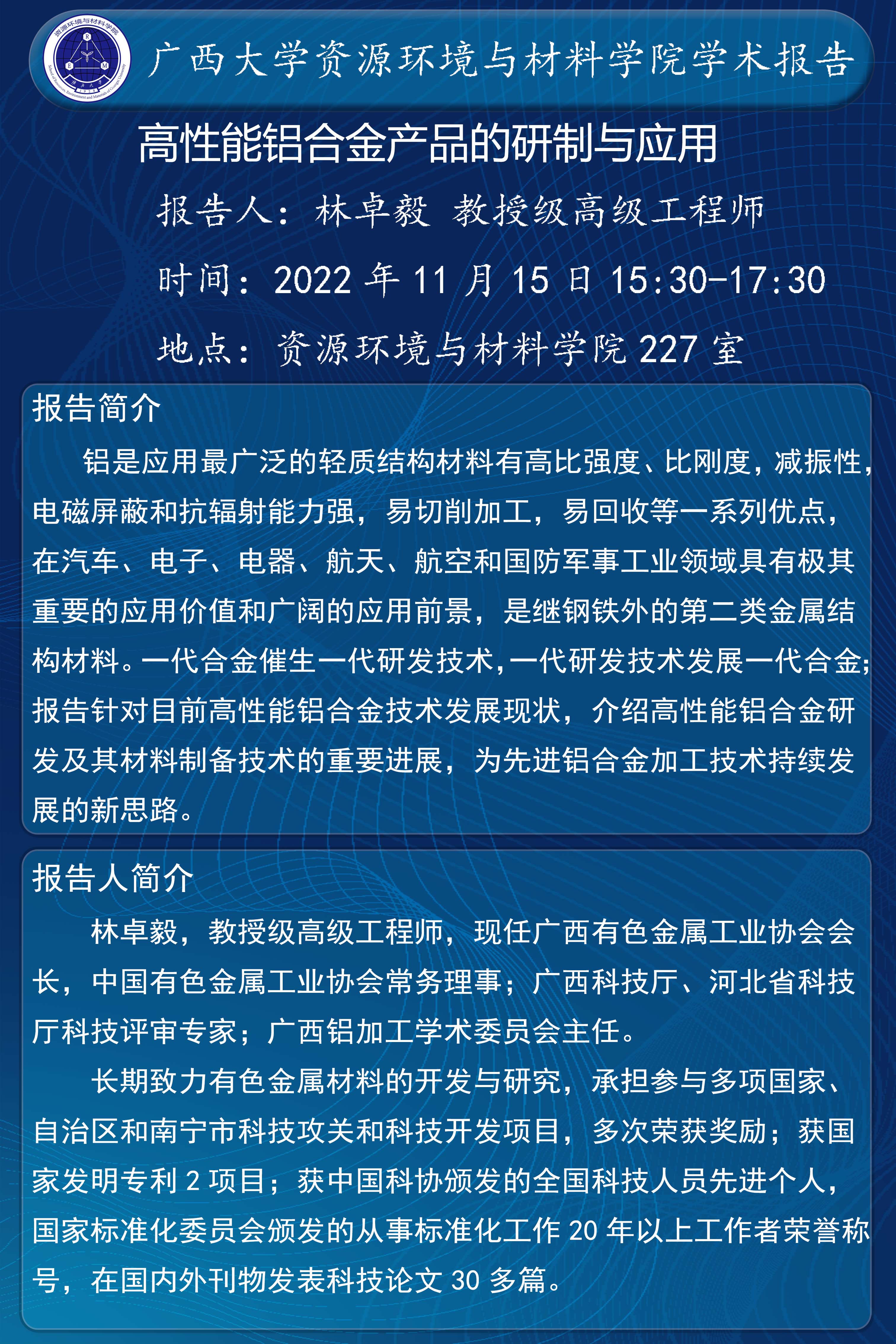 资源环境与材料学院学术报告:高性能铝合金产品的研制与应用