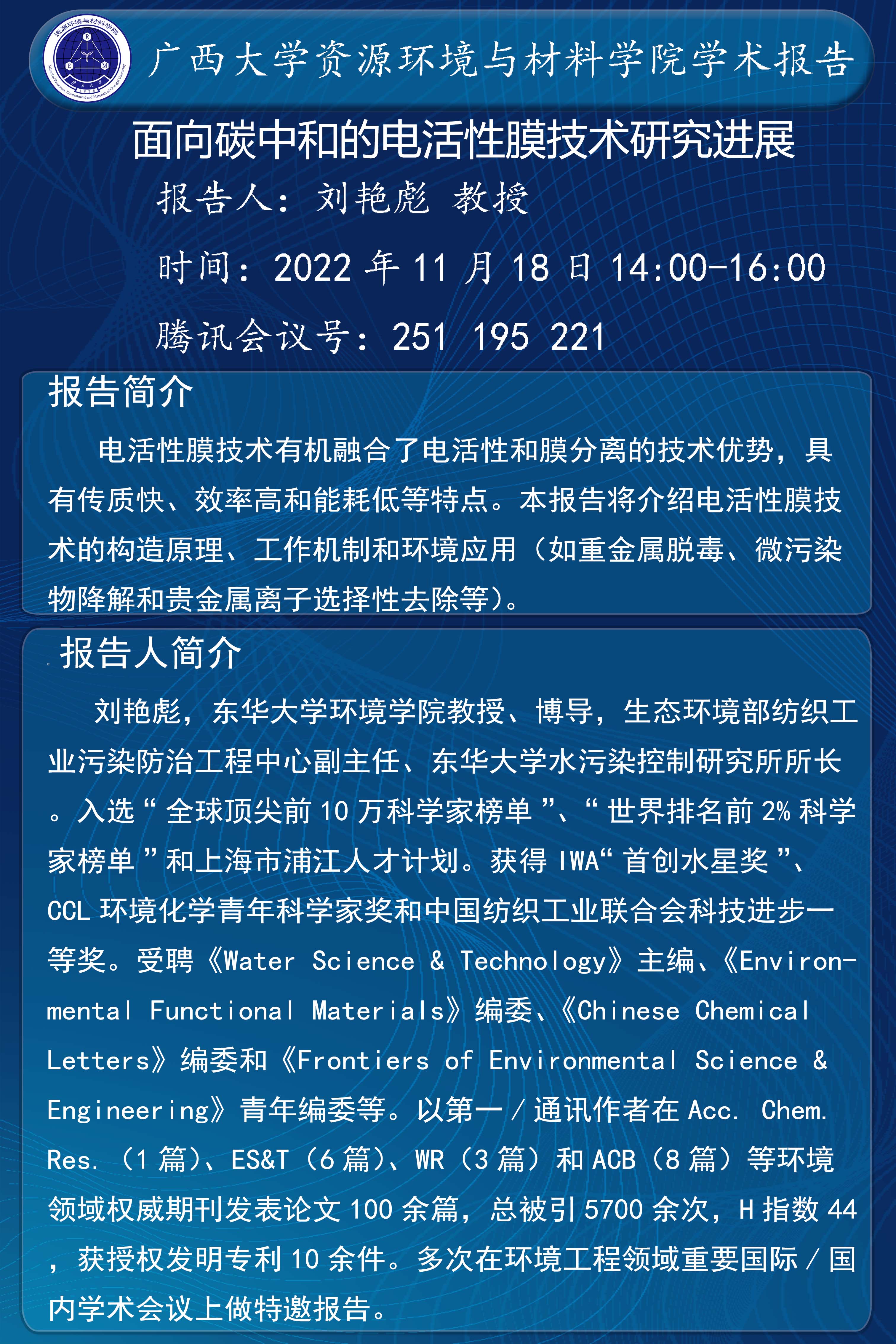 资源环境与材料学院学术报告 面向碳中和的电活性膜技术研究进展