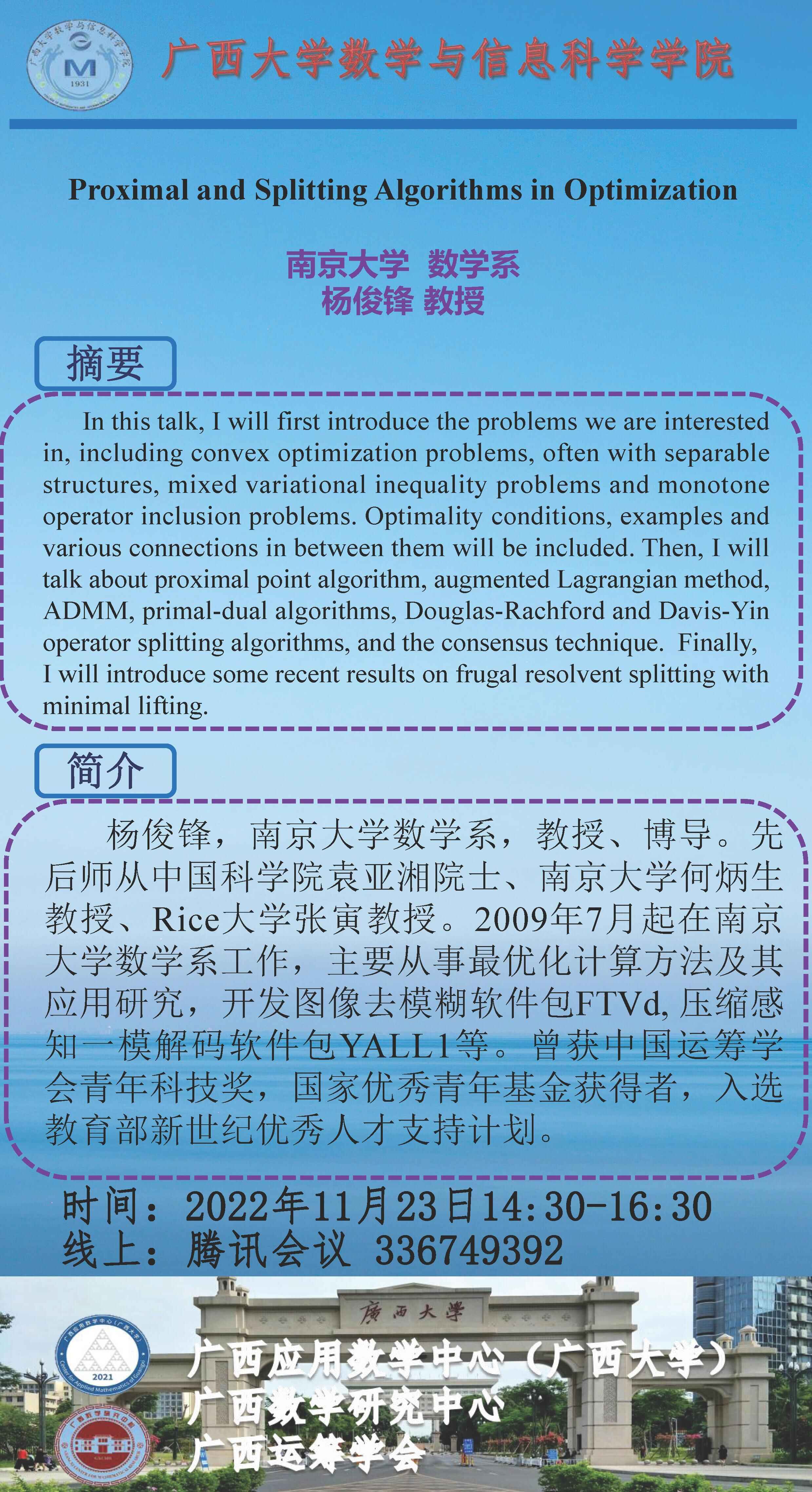 数学与信息科学学院/广西应用数学中心(beat365英国官方网站)学术报告Proximal and Splitting Algorithms in Optimization