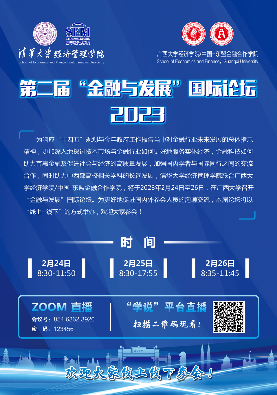 【主办方】清华大学经济管理学院、beat365英国官方网站经济学院/中国-东盟金融合作学院【学术活动日期】2023年2月24-26日【时间】2月24日8:30-11:50 2月25日8:30-17:55 2月26日8:35-11:45 【地址】2月24日 beat365英国官方网站新闻学院融媒体中心 2月25-26日 beat365英国官方网站君武馆