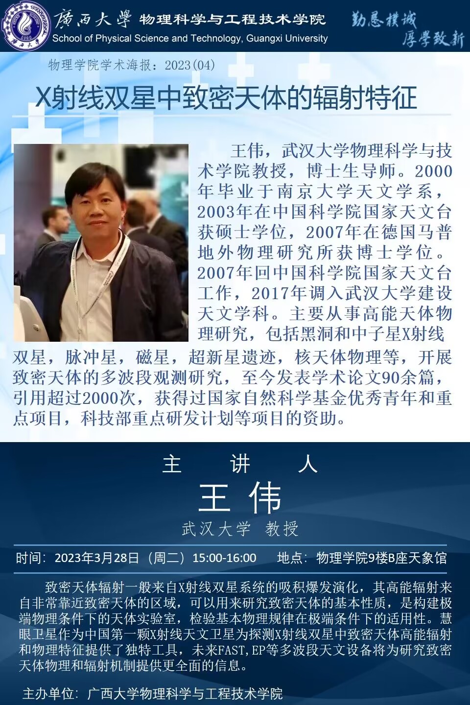 上一条:物理学院2023年学术报告系列之05:海外名师大讲堂——Testing General Relativity with black hole X-ray data