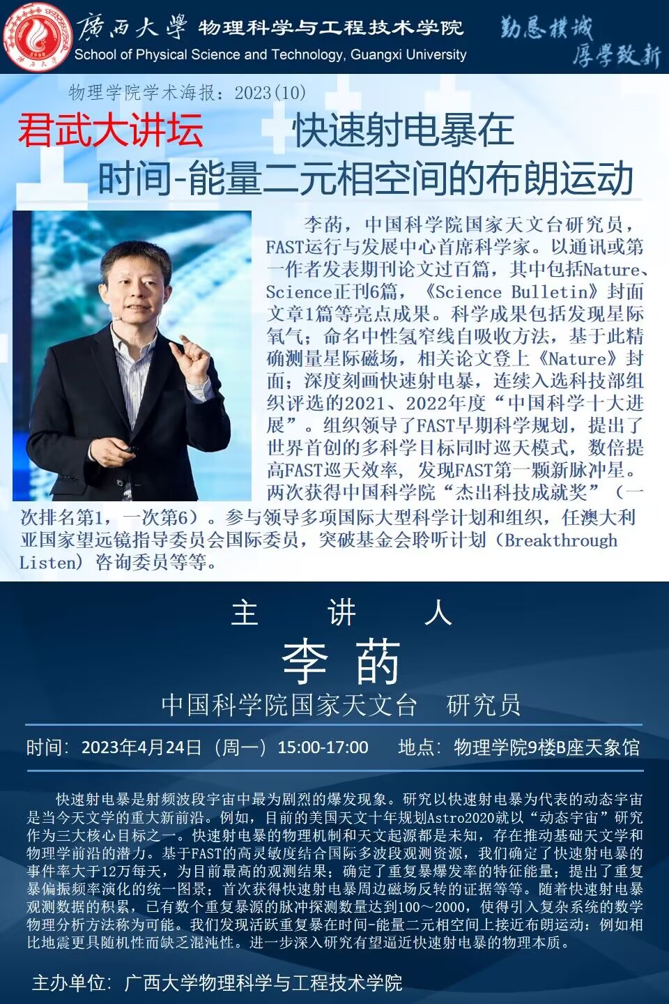 物理学院2023年学术报告系列之10:君武大讲坛——快速射电暴在时间-能量二元相空间的布朗运动