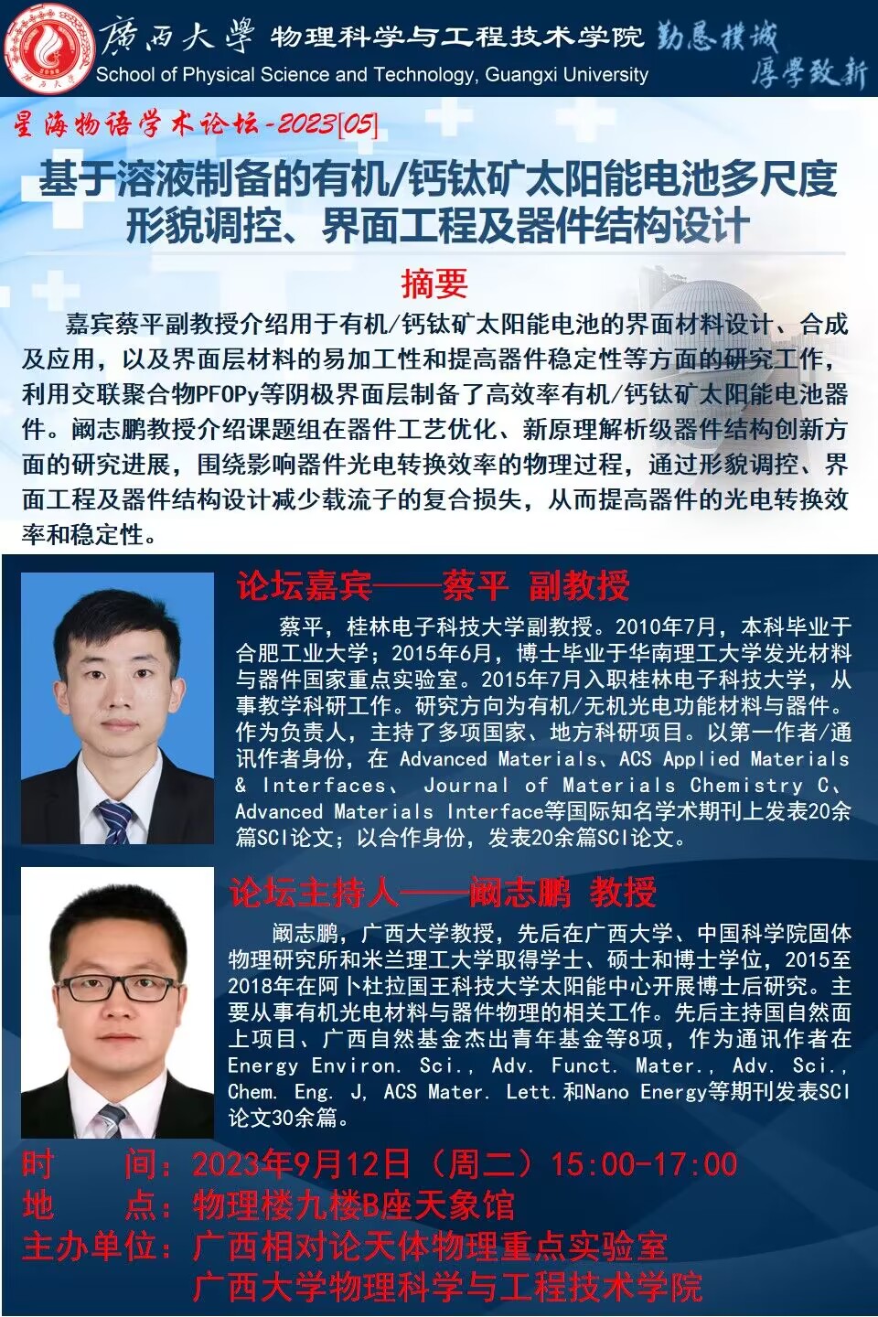 物理学院2023年星海物语学术论坛(第五期):基于溶液制备的有机/钙钛矿太阳能电池多尺度形貌调控、界面工程及器件结构设计