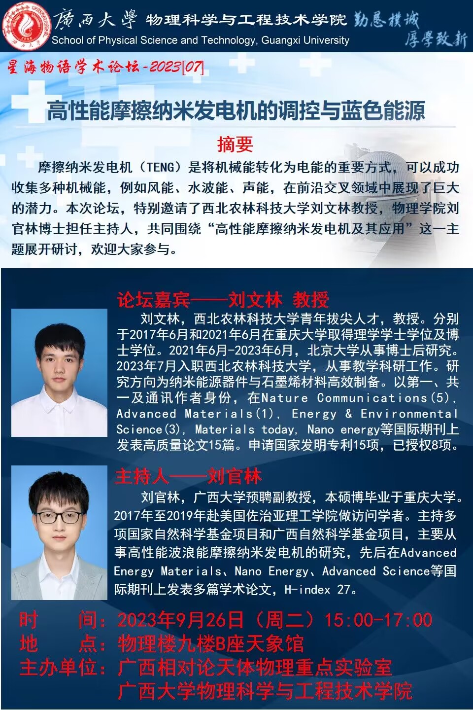 物理学院2023年星海物语学术论坛(第七期):高性能摩擦纳米发电机的调控与蓝色能源