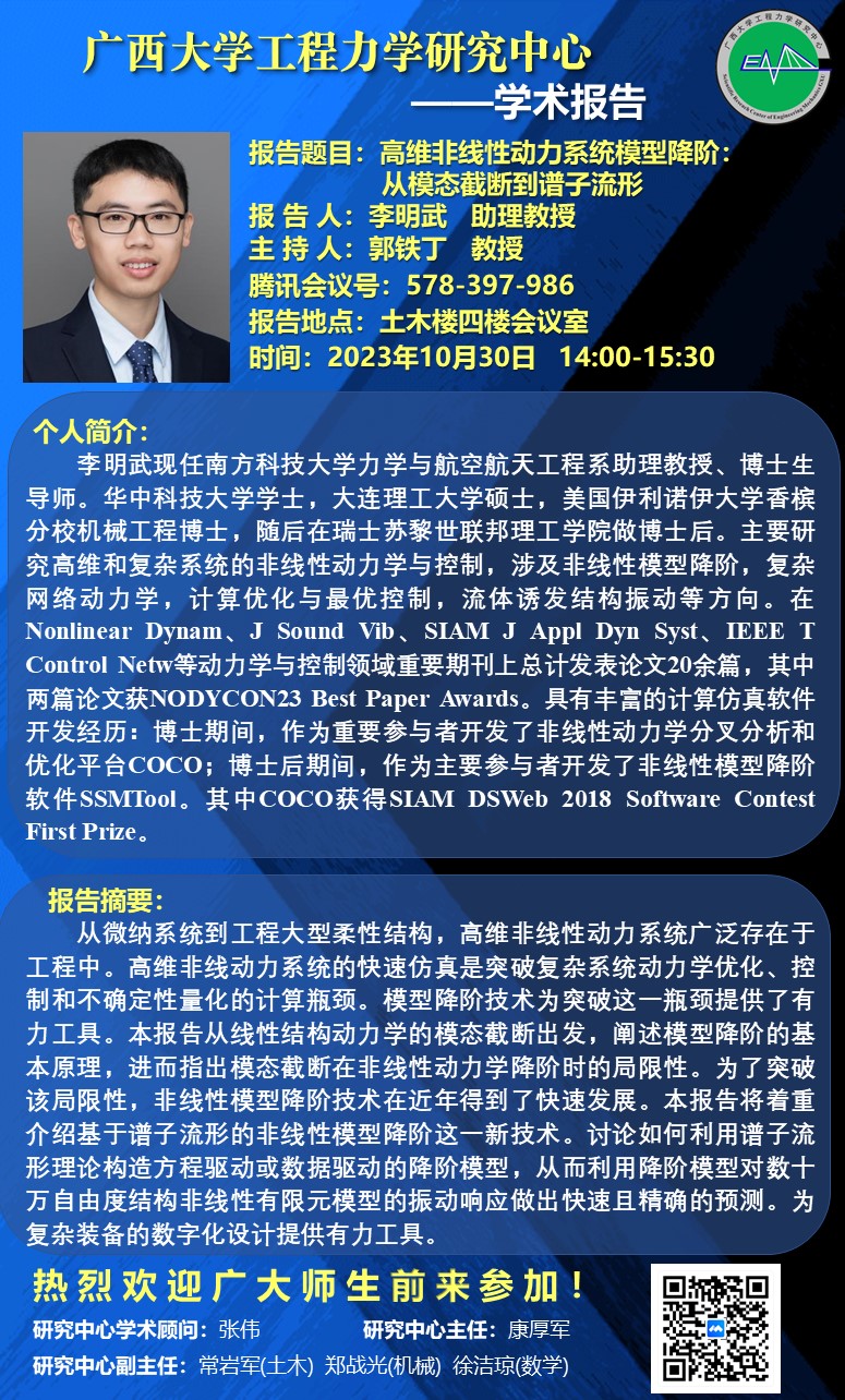土木建筑工程学院学术报告:高维非线性动力系统模型降阶——从模态截断到谱子流形