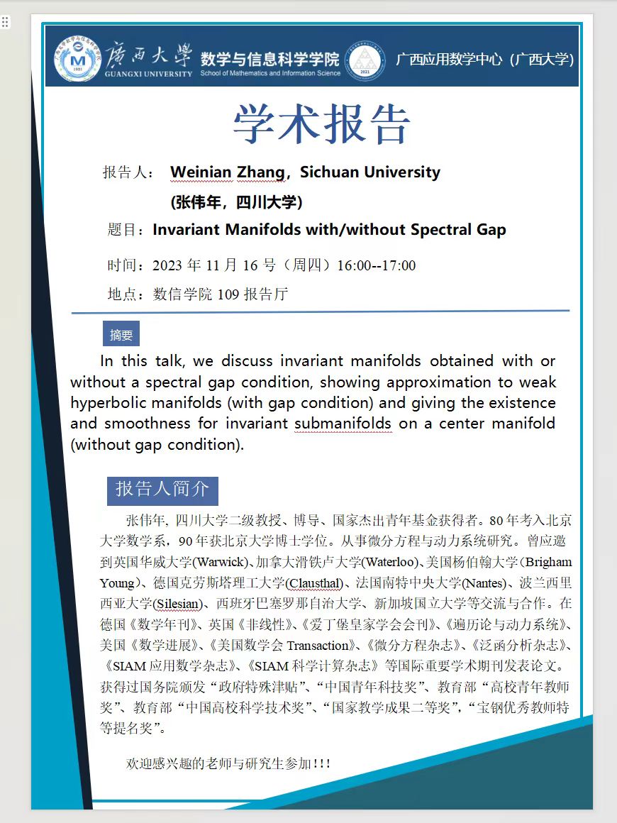 数信学院学术报告:Invariant Manifolds with/without Spectral Gap