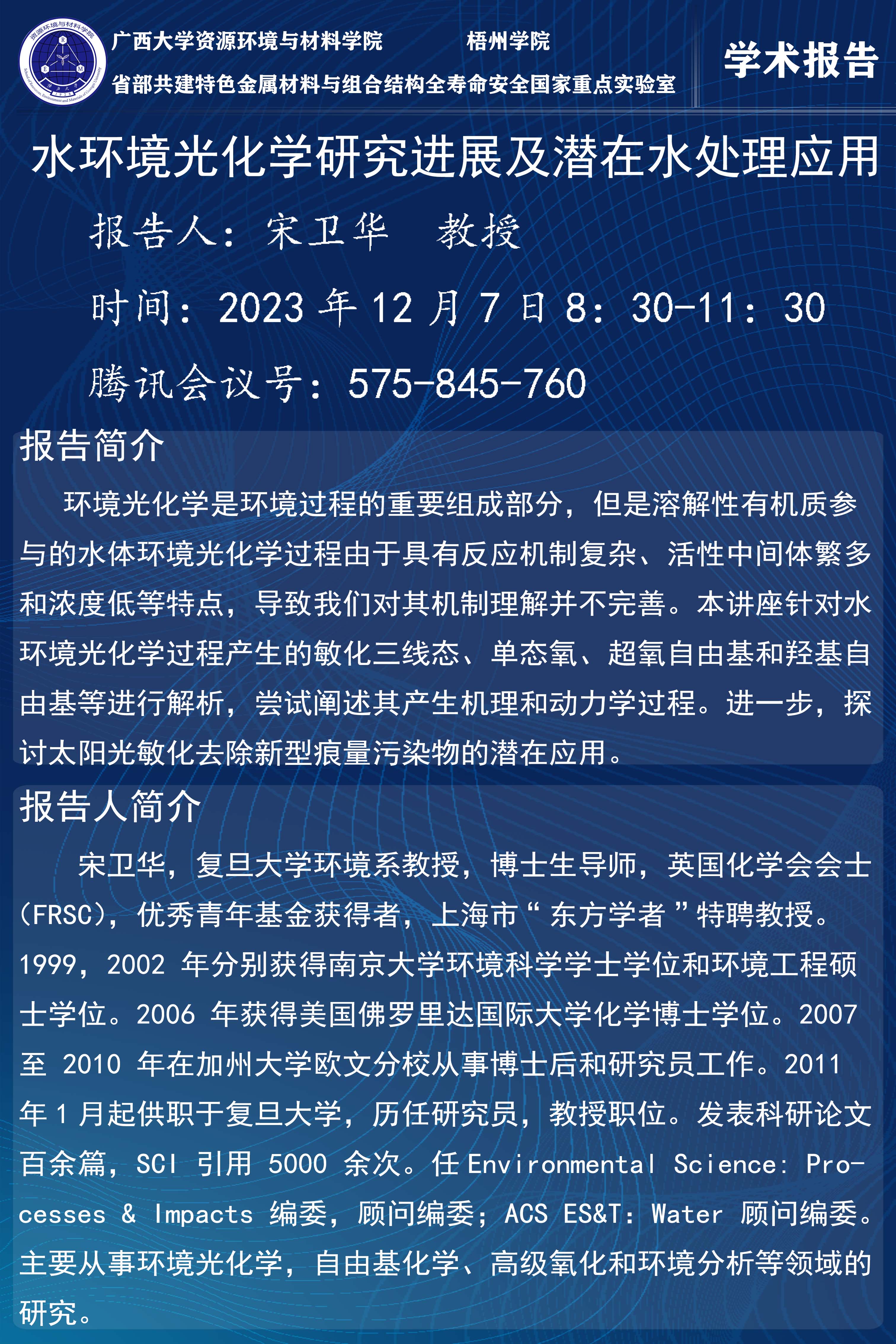 资源环境与材料学院学术报告:水环境光化学研究进展及潜在水处理应用