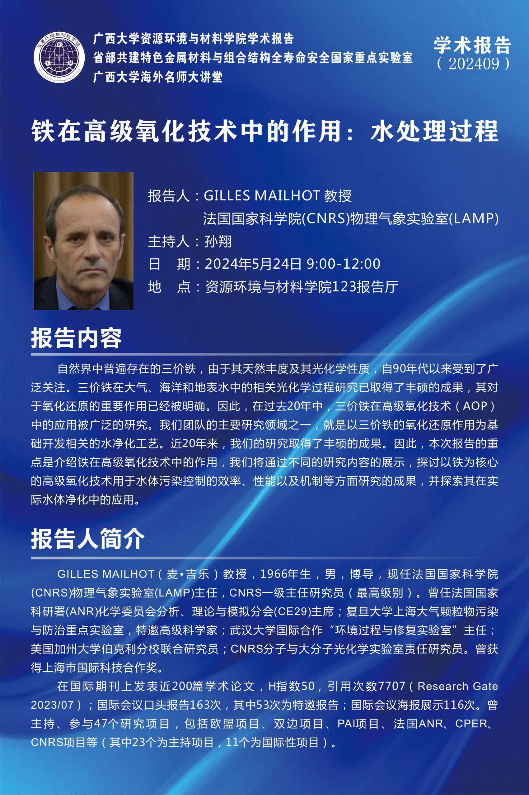 beat365英国官方网站海外名师大讲堂、资源环境与材料学院学术报告 :铁在高级氧化技术中的作用----水处理过程
