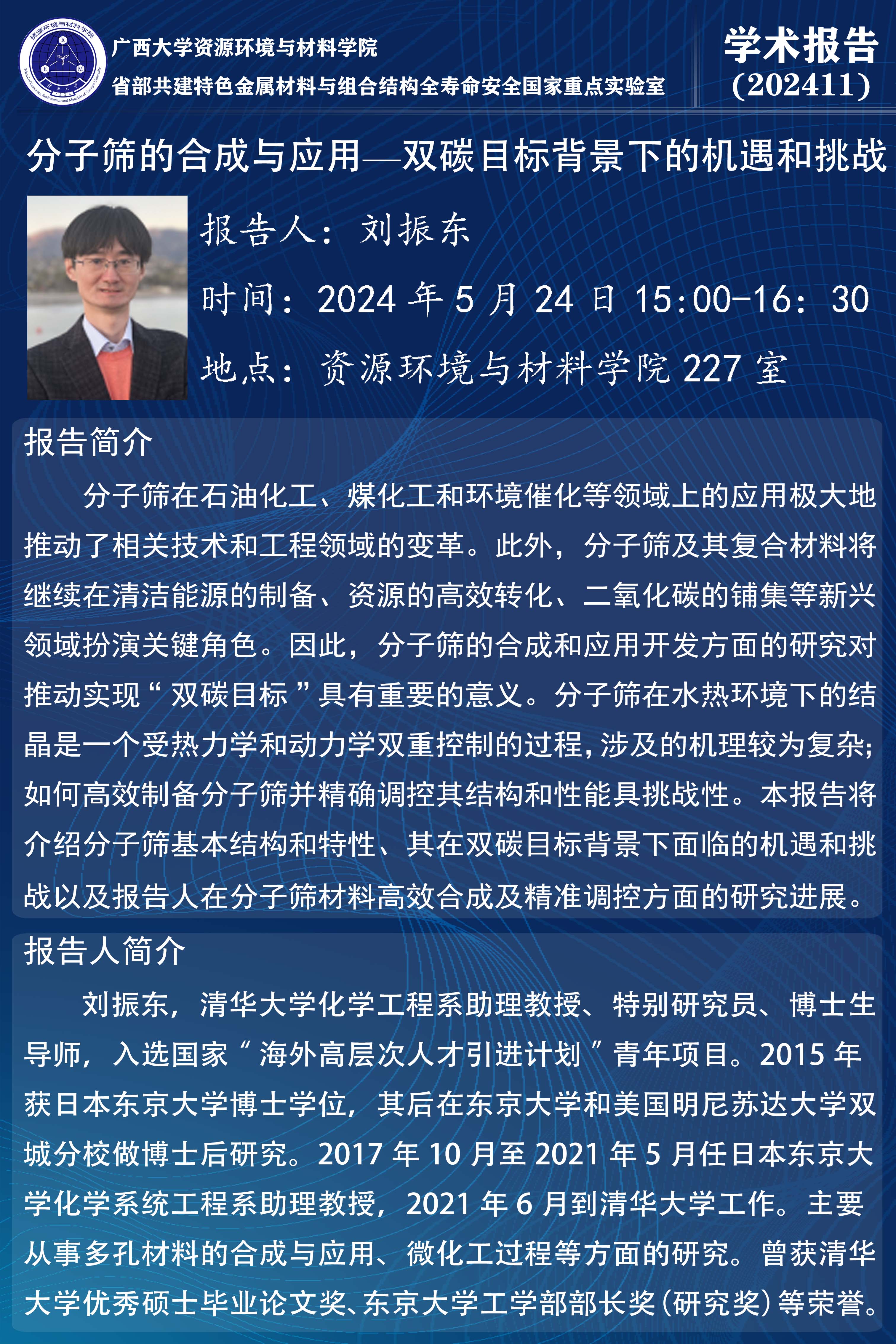资源环境与材料学院学术报告:分子筛的合成与应用一双碳目标背景下的机遇和挑战