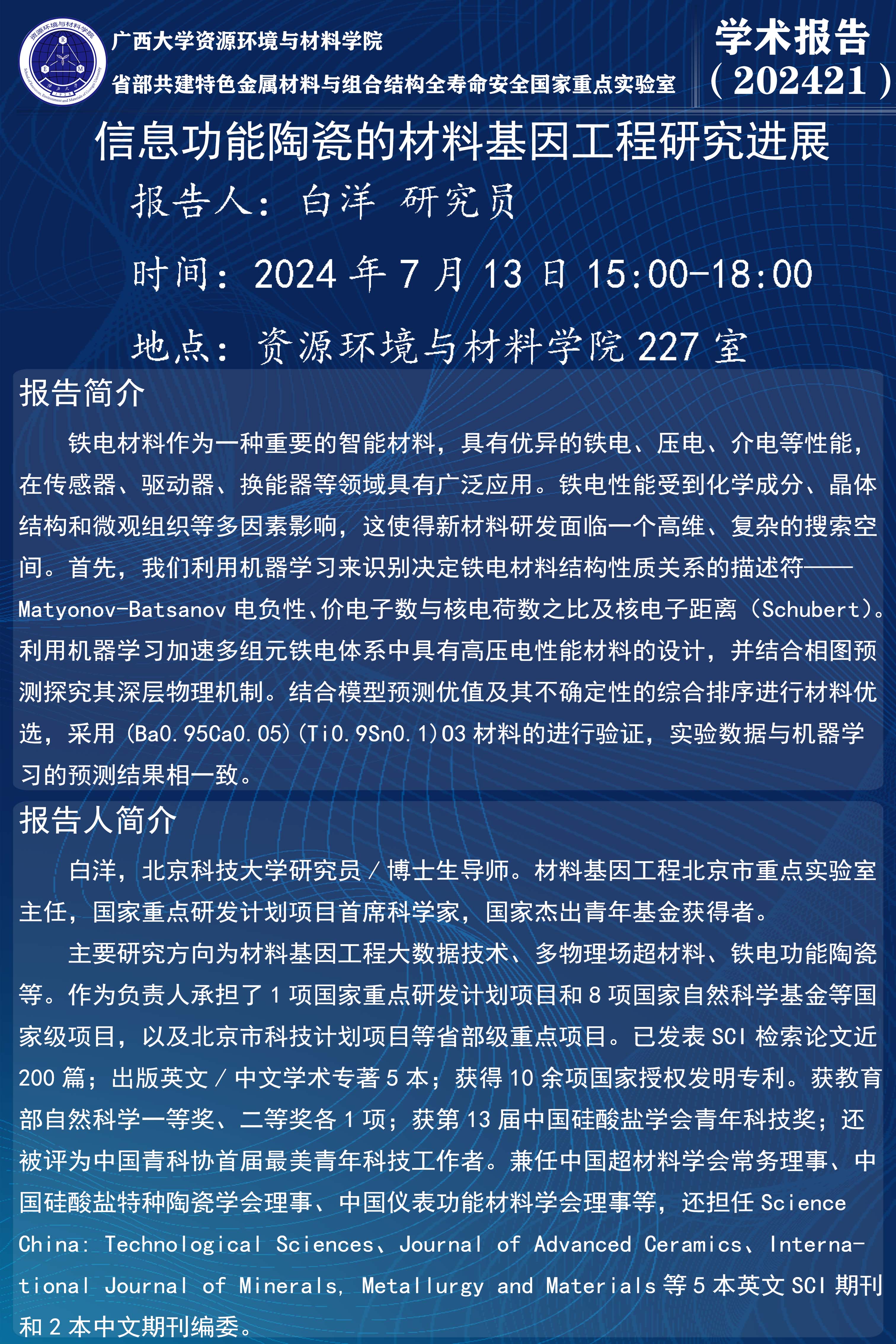 资源环境与材料学院学术报告:信息功能陶瓷的材料基因工程研究进展