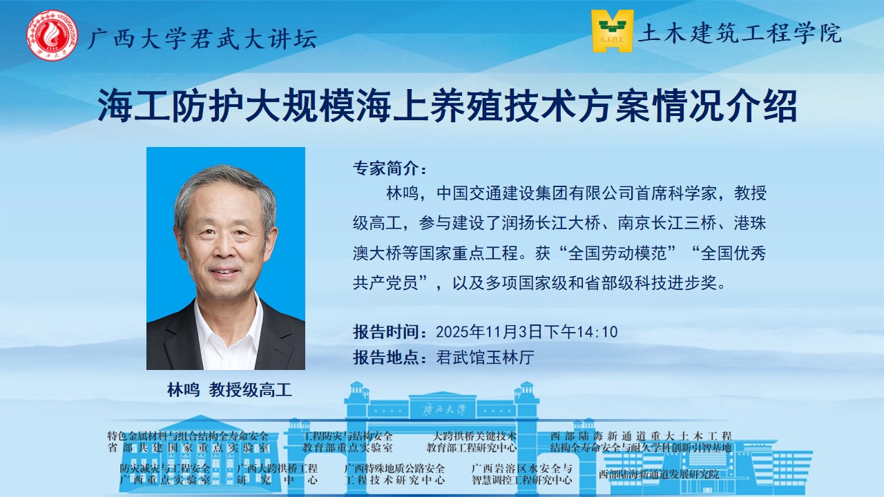 君武大讲坛、土木建筑工程学院学术报告:海工防护大规模海上养殖技术方案情况介绍