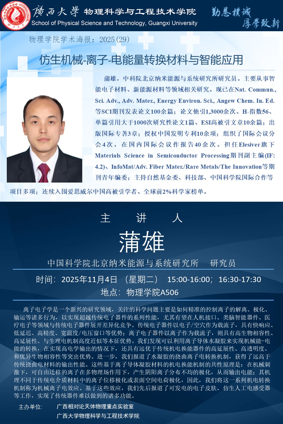 物理科学与工程技术学院学术报告:仿生机械-离子-电能量转换材料与智能应用