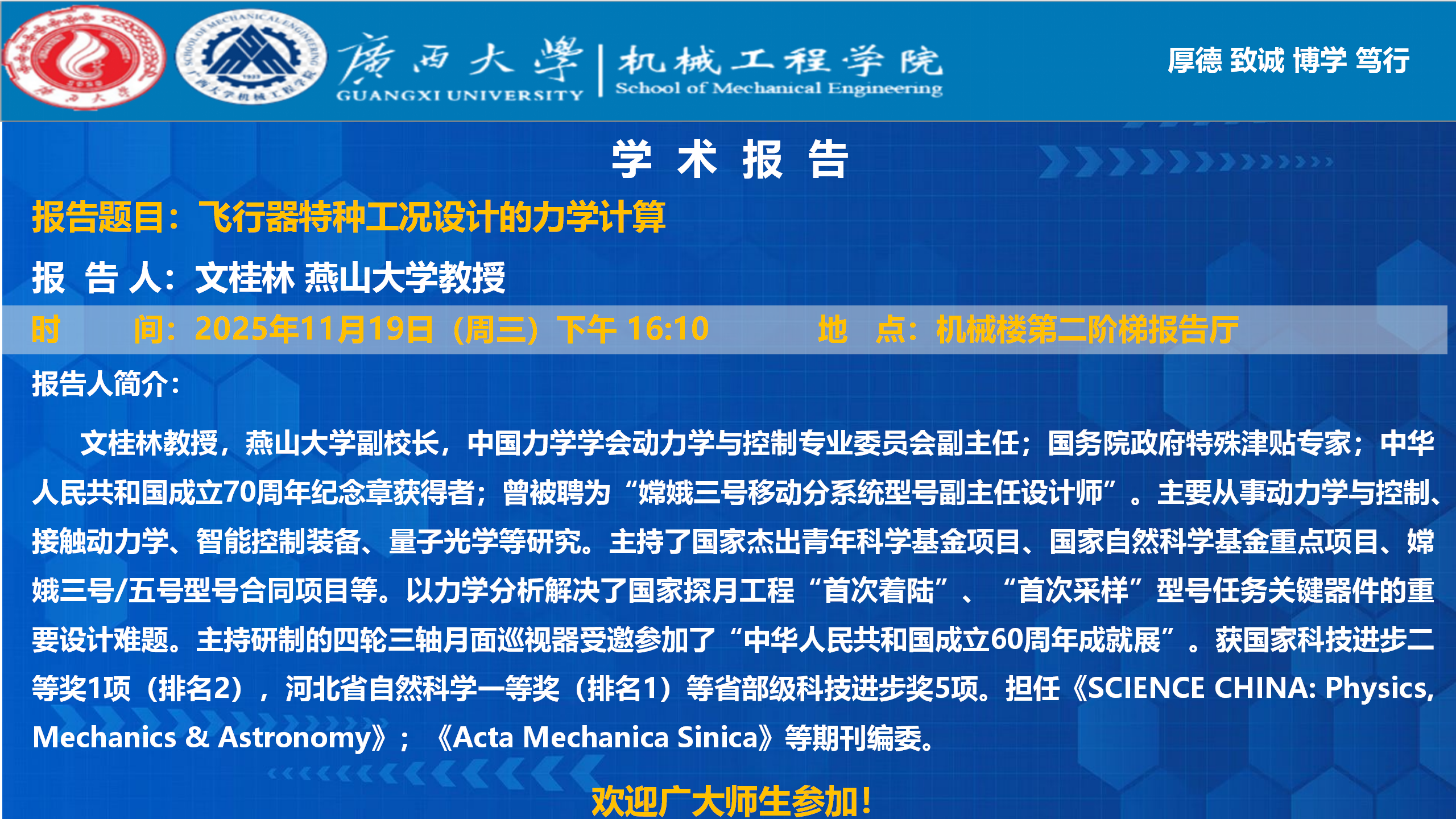 君武大讲坛、机械工程学院学术报告:飞行器特种工况设计的力学计算