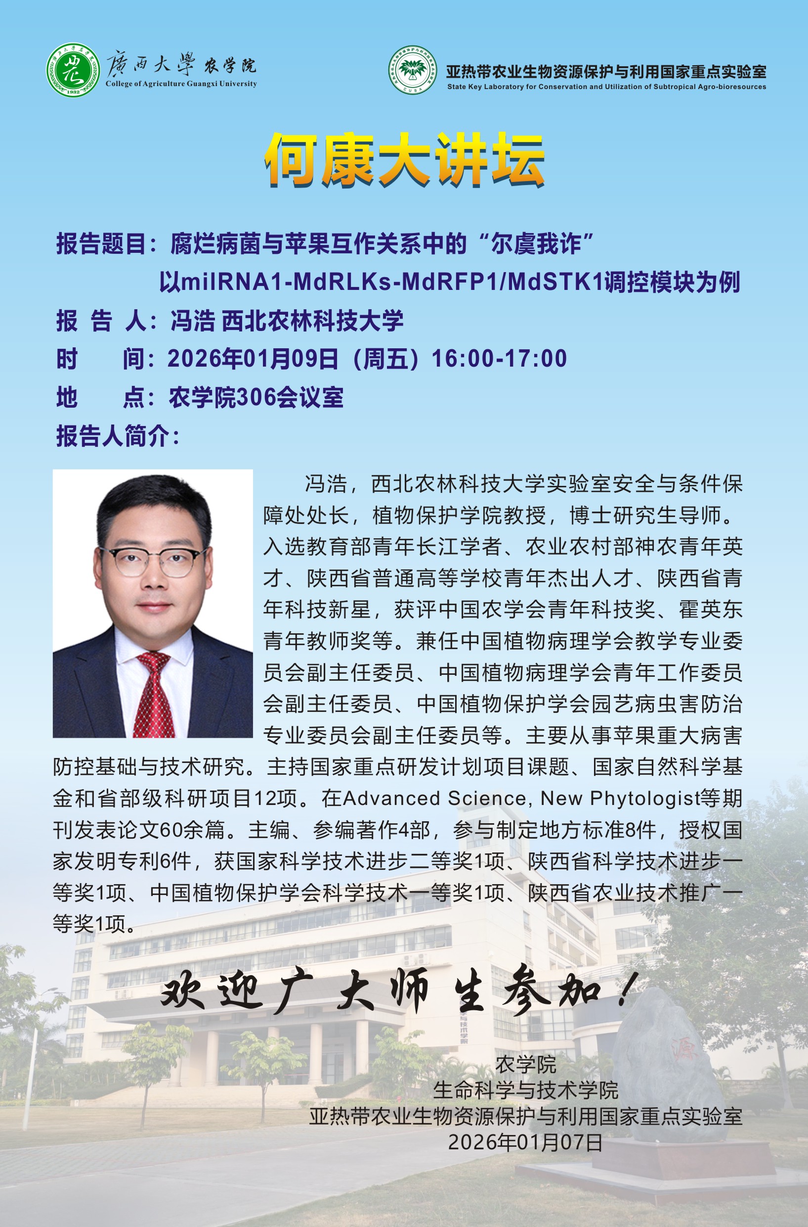 农学院何康大讲坛:腐烂病菌与苹果互作关系中的“尔虞我诈”以milRNA1-MdRLKs-MdRFP1/MdSTK1调控模块为例