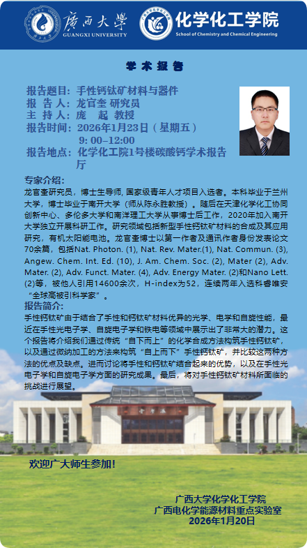 上一条:资源环境与材料学院学术报告:稀土发光材料与稀有金属发光芯片引领产业变革