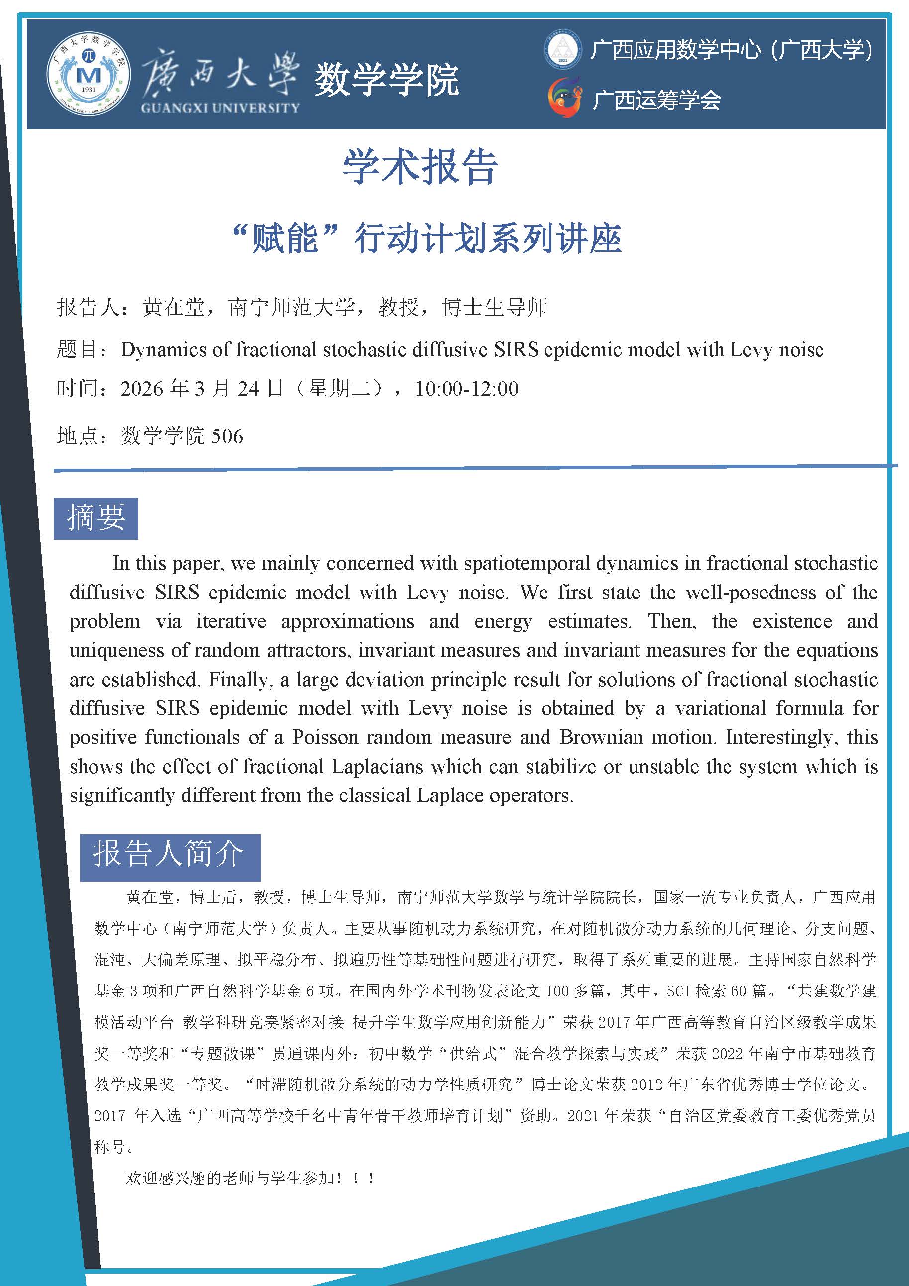 数学学院学术报告:Dynamics of fractional stochastic diffusive SIRS epidemic model with Levy noise