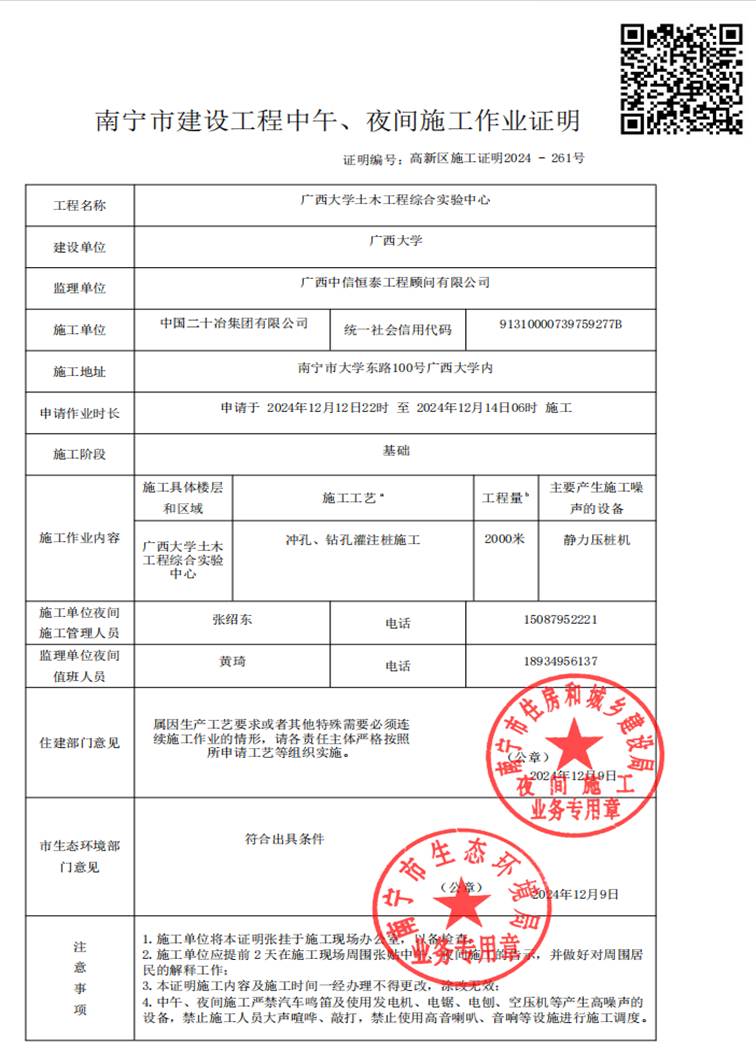 我单位承建的beat365英国官方网站土木工程综合实验中心项目因施工工艺需要,在符合法律许可的夜间施工条件之下,经南宁市住房和城乡建设局、南宁市生态环境局核准,计划于2024年12月12日22:00—2024年12月14日6:00进行静压桩施工。我单位将严格按照建设局、环保局要求,采取有效措施尽可能减少影响。施工期间可能会对广大师生员工的日常生活造成一定的干扰。对此,我们深表歉意,敬请谅解。