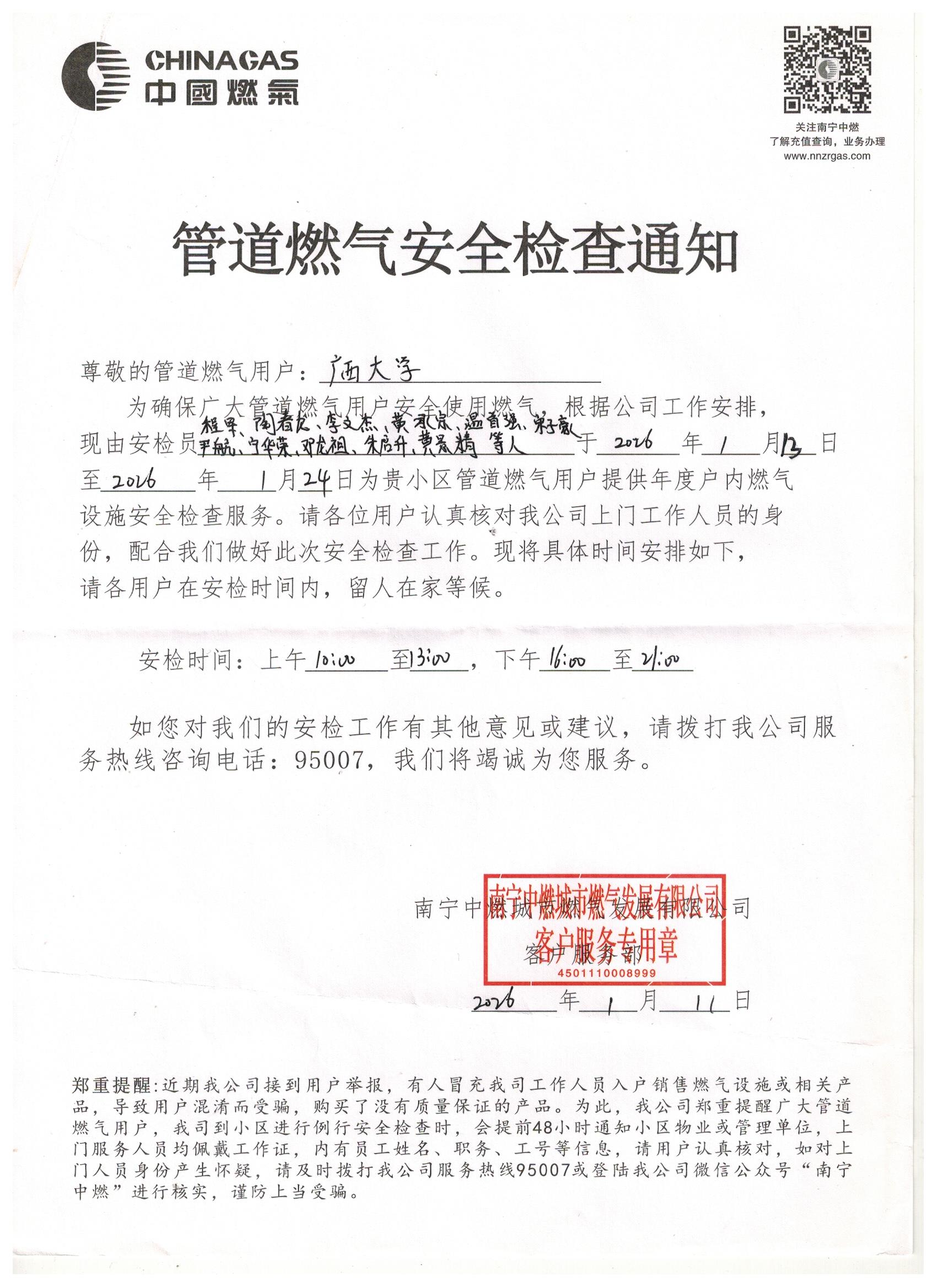 为保障校园用气安全,后勤基建处联系南宁中燃城市燃气发展有限公司,对校内管道燃气用户开展入户安全检查。请各位住户在此期间做好相关配合工作,现将具体通知如下: